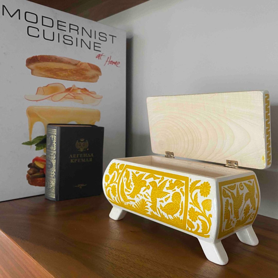 Este baúl tostonero es elaborada por artesanos de Olinalá en madera de pino, se lijan para darle una textura mas plana, se agregan capas de tierra con aceite de chía para luego tallar o rayar y dar el diseño final a mano, sin moldes.