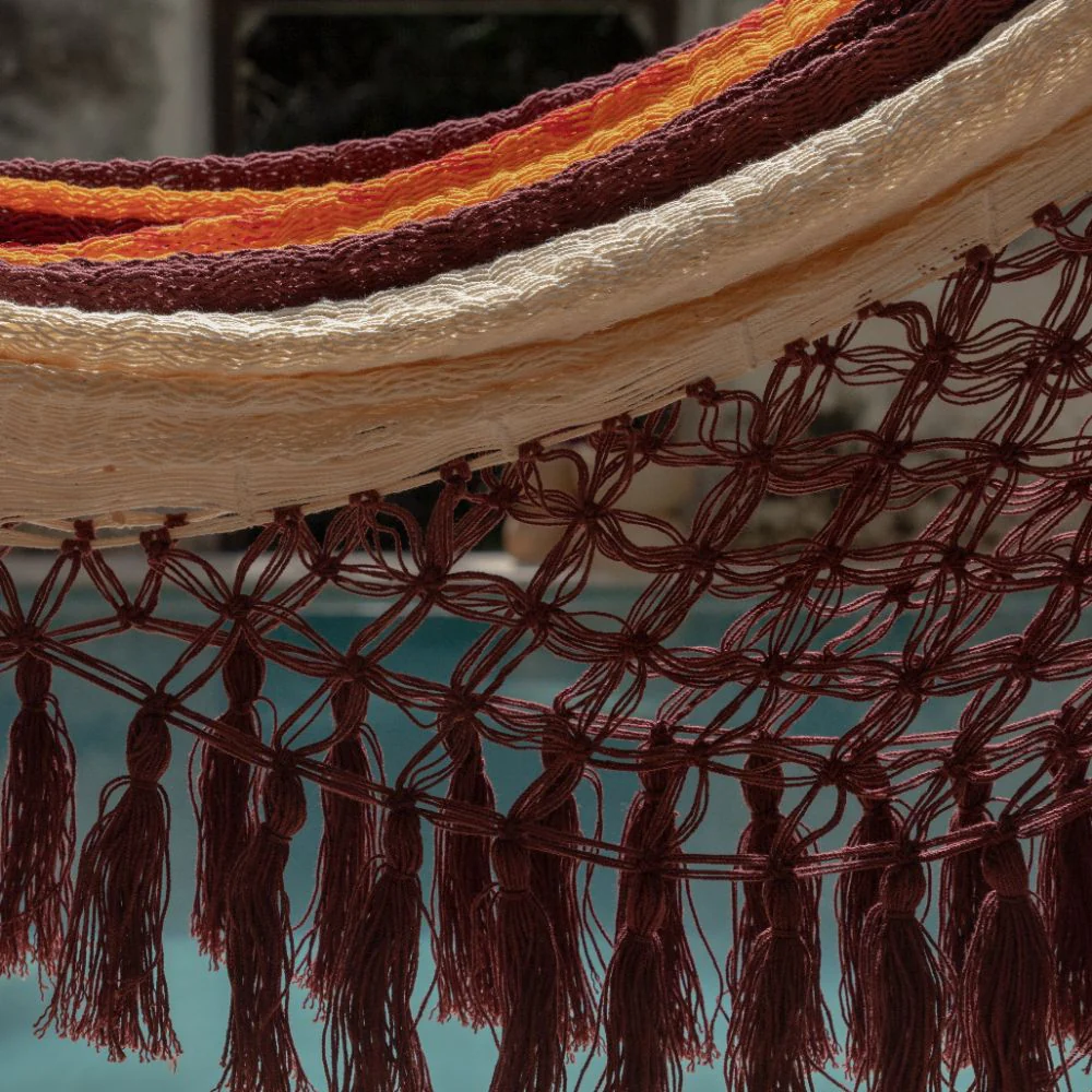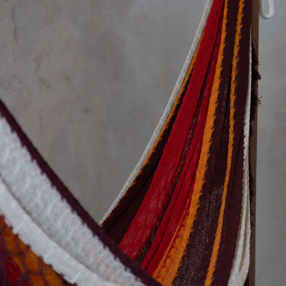 La Hamaca Maya, elaborada en el taller Los Flamboyanes (San Antonio Yaxche, Campeche), combina rojo, naranja, vino y crudo. Tejida con puntada simple y macramé, rinde homenaje a la calidez familiar y al talento artesanal femenino.