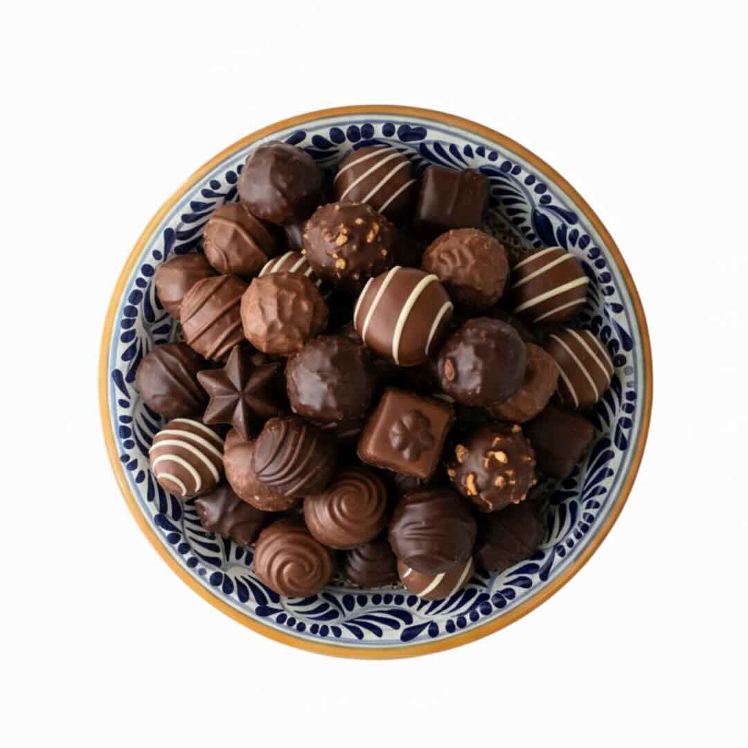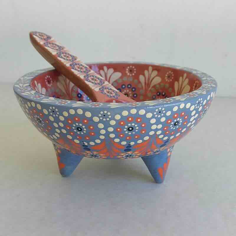 Bello molcajete artesanal elaborado por artesanos michoacanos bajo la técnica de capulineado en diversidad de colores, con cuchara para servicio y con dulces tradicionales mexicanos o chocolates premium.
